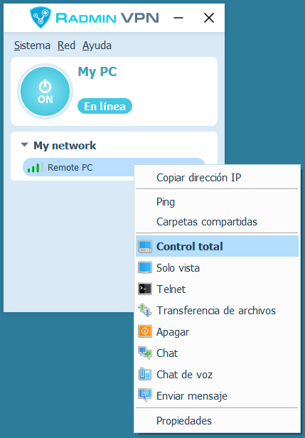 Seleccione: «Radmin-- > Control total» en el menú de atajo del ordenador remoto.