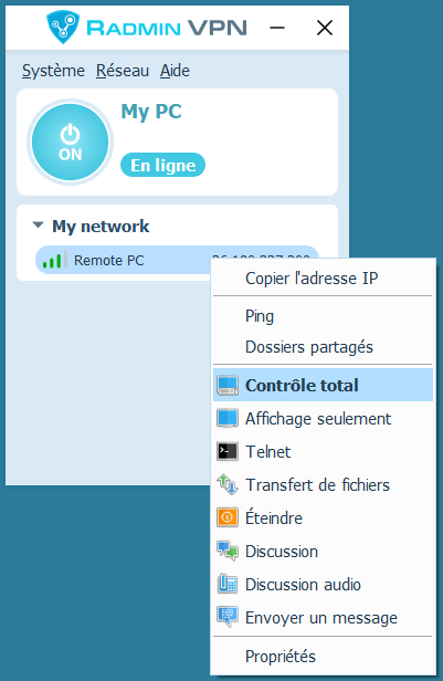 Choisissez : « Radmin-- > Contrôle total » dans le menu de raccourcis de l’ordinateur distant.