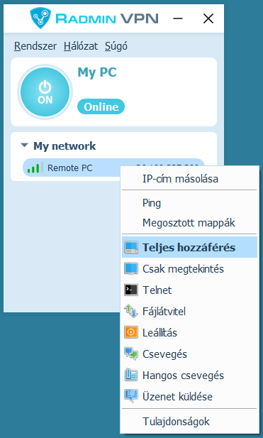 Válassza a következőt: „Radmin-- > Teljes hozzáférés” a távoli számítógép helyi menüjében.