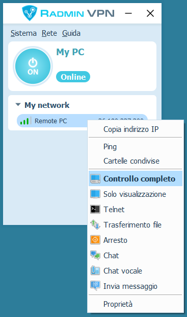 Scegli: “Radmin--> Controllo completo” nel menu di scelta rapida del computer remoto.
