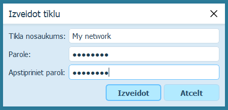 Ievadiet tīkla nosaukumu un paroli dialoglodziņā.