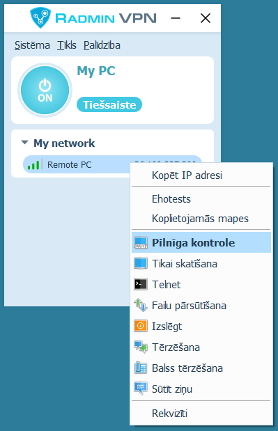 Savienojums starp datoriem ir izveidots veiksmīgi. Savienojumu var pārbaudīt, izsaucot ehotestēšanas komandu «ping», kas ir atrodama attālā datora kontekstizvēlnē.