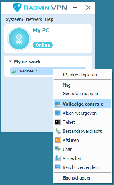 Selecteer: ‘Radmin-- > Volledige controle’ in het snelmenu van de externe computer.