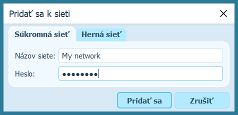 V dialógovom okne zadajte položky Názov siete a Heslo.
