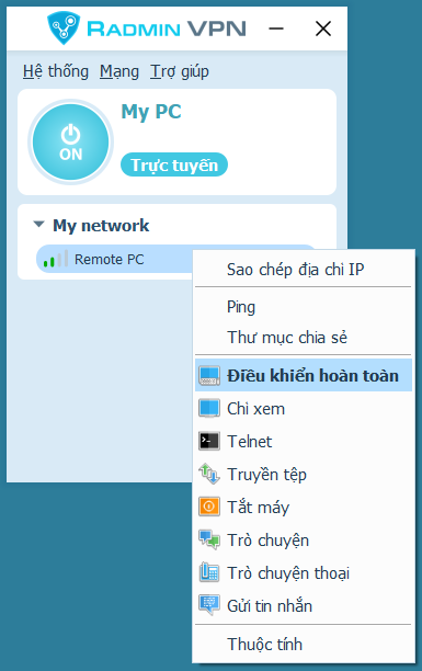 Chọn: "Radmin-- > Điều khiển hoàn toàn" trong menu tắt của máy tính từ xa.